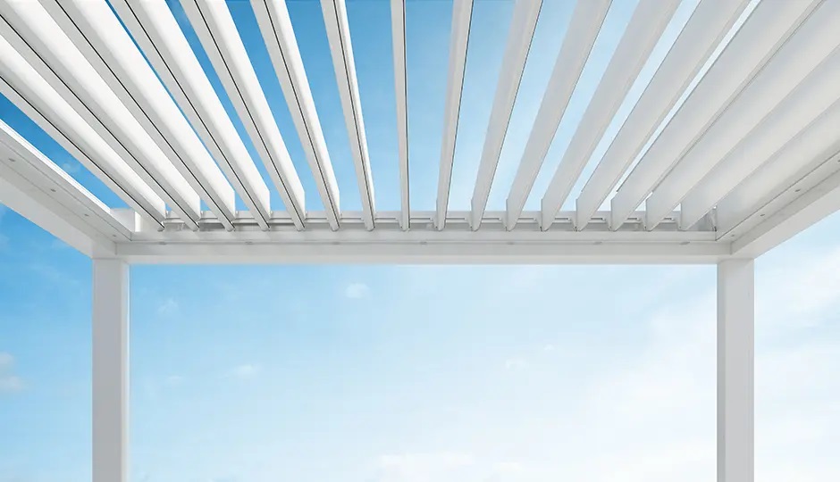 Grazie al brevetto Velvet Motion le lame possono ruotare in funzione dell’orientamento solare secondo un angolo variabile da 0° a 85° creando un microclima confortevole o essere impacchettate completamente e liberare lo sguardo verso il cielo.