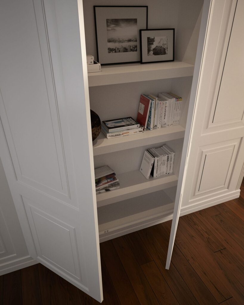 Infine, il sottoscala chiuso con le ante personalizzabili, può essere adoperato anche con funzione di libreria. Qui sotto ti mostriamo due diversi esempi: uno in stile classico, con ante laccate bianche della collezione Dorè coordinate alla boiserie bianca laccata, e uno in stile moderno, con ante in vetro e accessori a contrasto. Due idee originali per sfruttare un sottoscala  rendendolo una comoda ed elegante libreria.