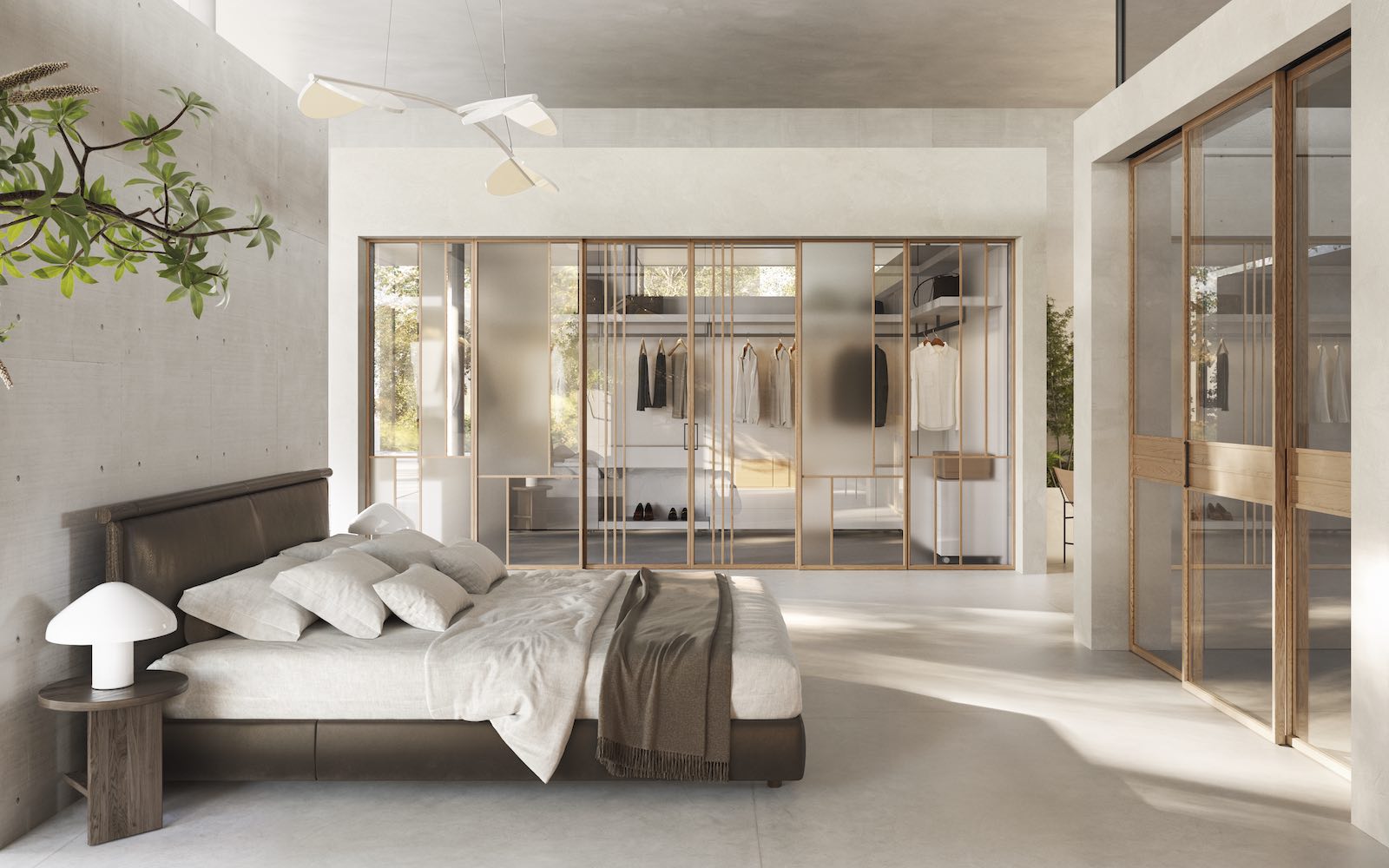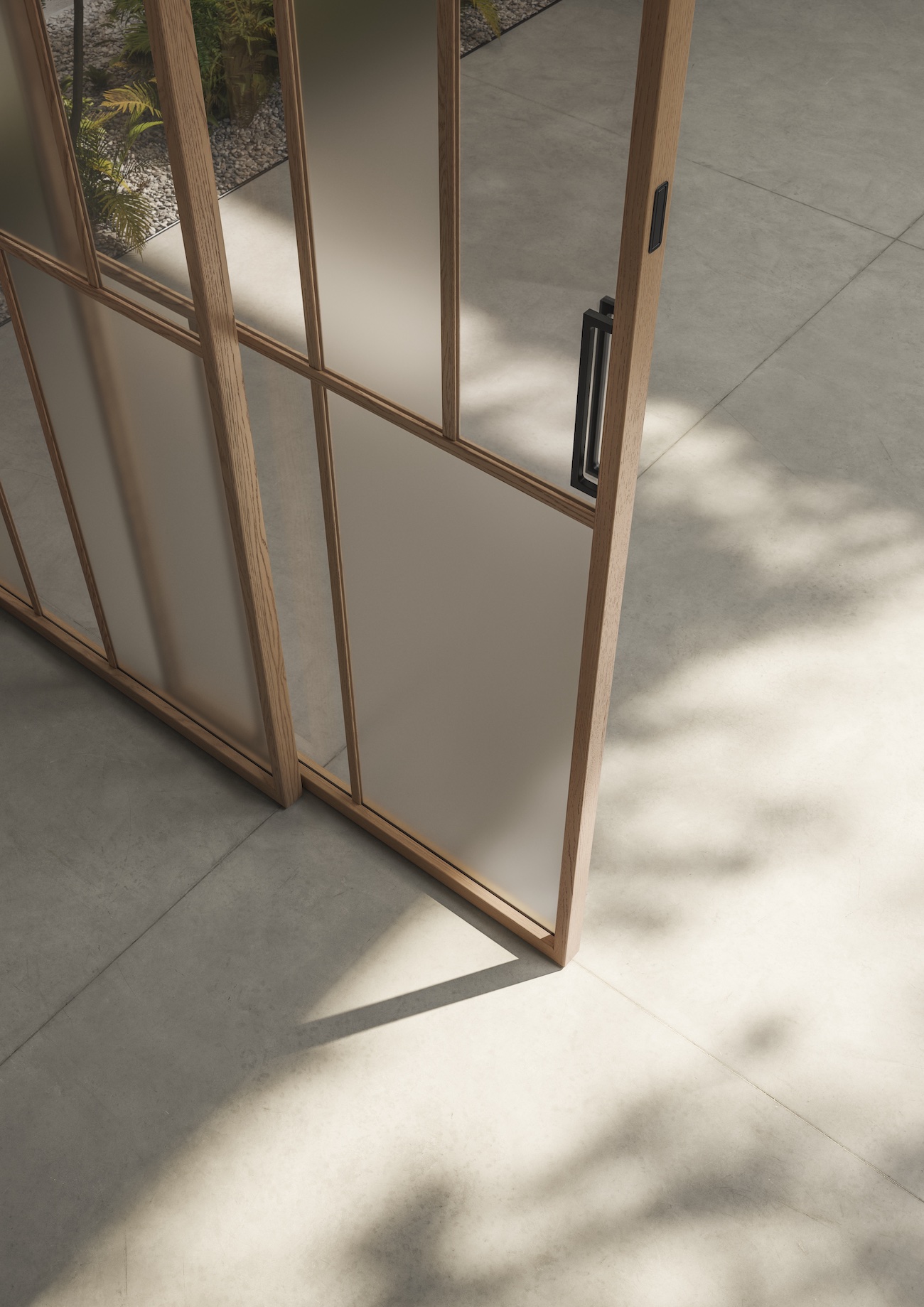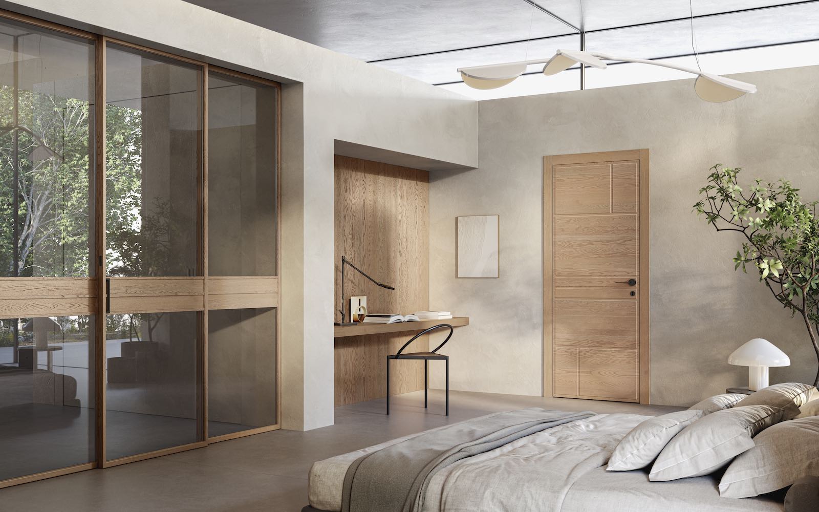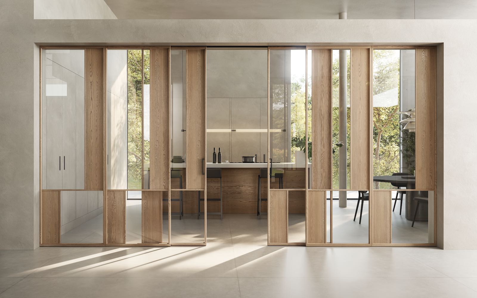 Alle ante in legno massiccio si affiancano, ricalcandone le geometrie, aperture composte da sottili profili in alluminio rivestiti in essenza, tra i quali giocano superfici trasparenti, satinate o ancora in legno. Una collezione che consente di suddividere diversi ambienti della casa senza separarli nettamente grazie agli elementi scorrevoli nei quali è possibile combinare i pannelli di legno a quelli di vetro oppure diverse tipologie di ante vetrate: da quelle trasparenti a quelle riflettenti madras.