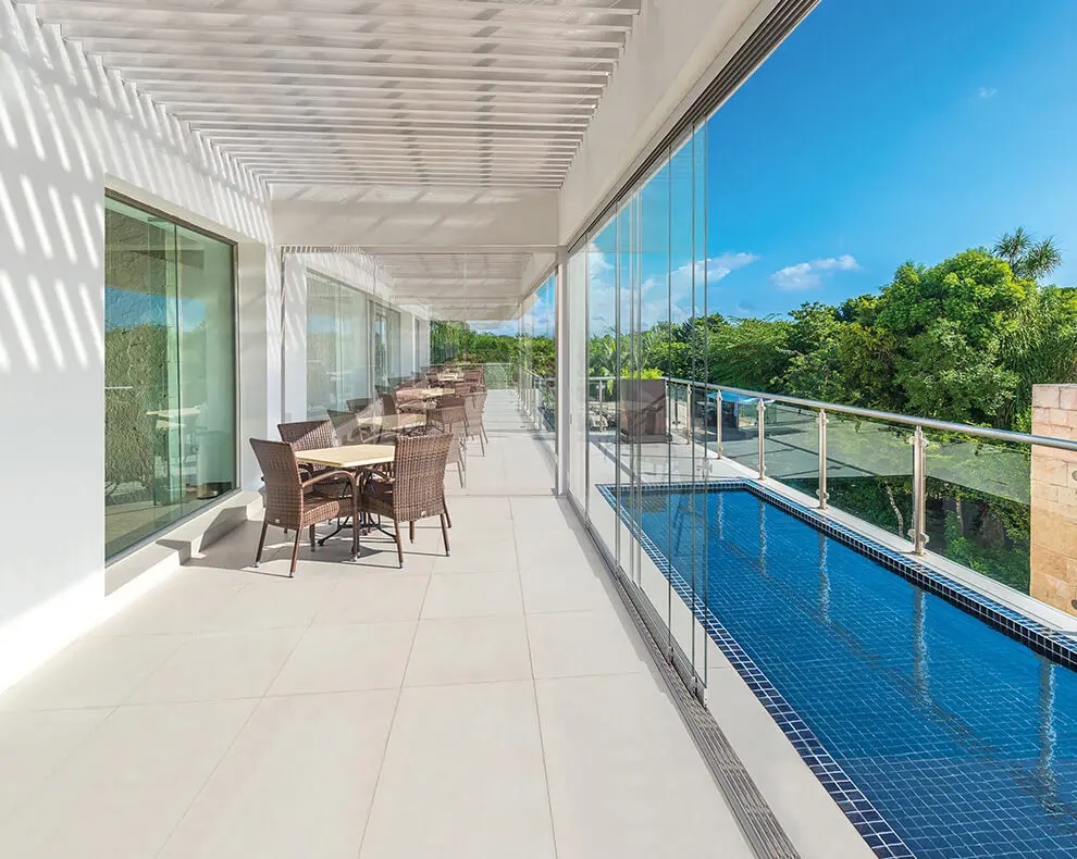 Vetri temperati, extrachiari o satinati, abbinati a una struttura in alluminio verniciato con binario in alluminio anodizzato argento. Sistema di smaltimento dell’eventuale acqua di condensa e abbattimento sonoro fino a 19 dB.