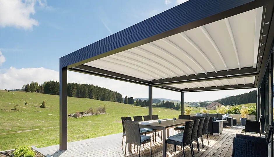 Grazie al materiale tecnico a tre strati, il tetto delle pergole crea uno schermo totale, protegge dal sole e raffresca l’ambiente sottostante.