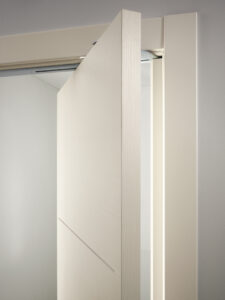 L’innovativa tecnologia si basa sullo spostamento del perno di rotazione della porta che così consente una notevole riduzione del raggio d’apertura.
