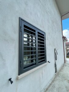 - PERSIANE IN ALLUMINIO A LAMELLE ORIENTABILI MODELLO BOMBATO SIA ANTA CHE TELAIO, AZIONAMENTO LAMELLE A GOCCIA CON MECCANISMO A LEVA INOX NERO,CERNIERE A MORSA ANTISOLLEVAMENTO MOD. SAVIO NERO