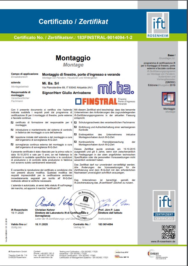La Mi.Ba. è l’unica azienda nel settore serramenti che può pregiarsi della certificazione di POSA CERTIFICATA già dal 2015, rilasciata dal prestigioso Istituto IFT Rosenheim, il più rinomato ente terzo specializzato a livello europeo in grado di rilasciare tale certificato.